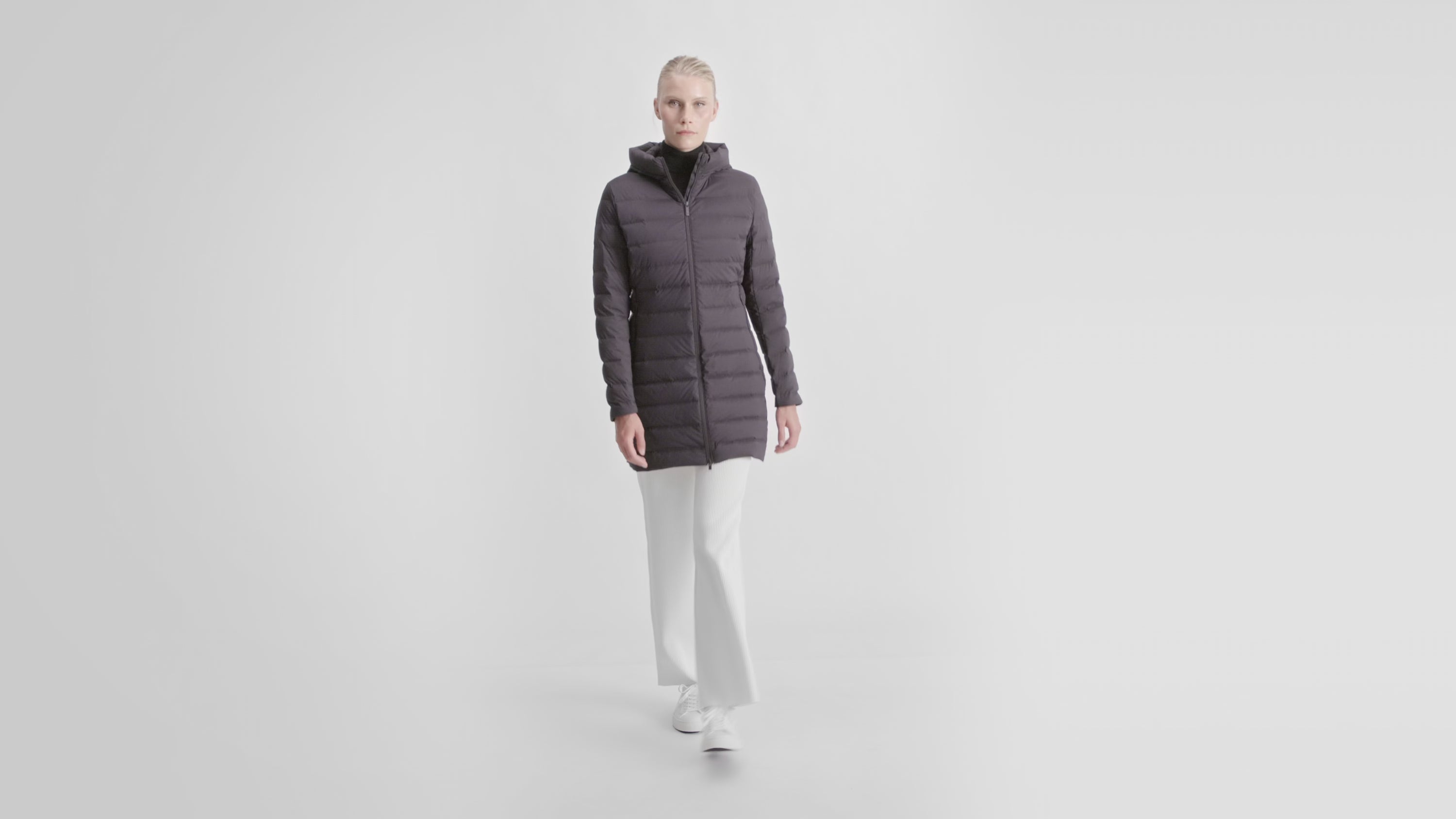 Ultra light down coat, full stretch with our highly technical sleek woven down channel. Your ideal companion when you are looking for something light, warm and easy to bring. Comfortable mid thigh length.