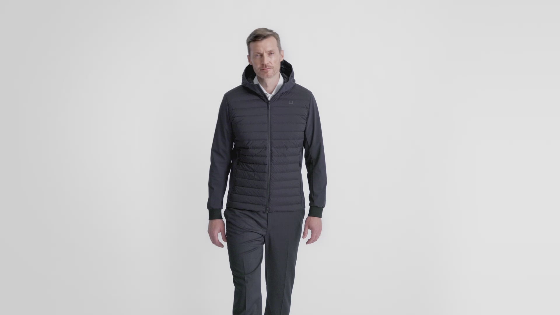 Innovative ultra light down jacket, with our hybrid construction. Sleek, full stretch sleeves and full protection hood.