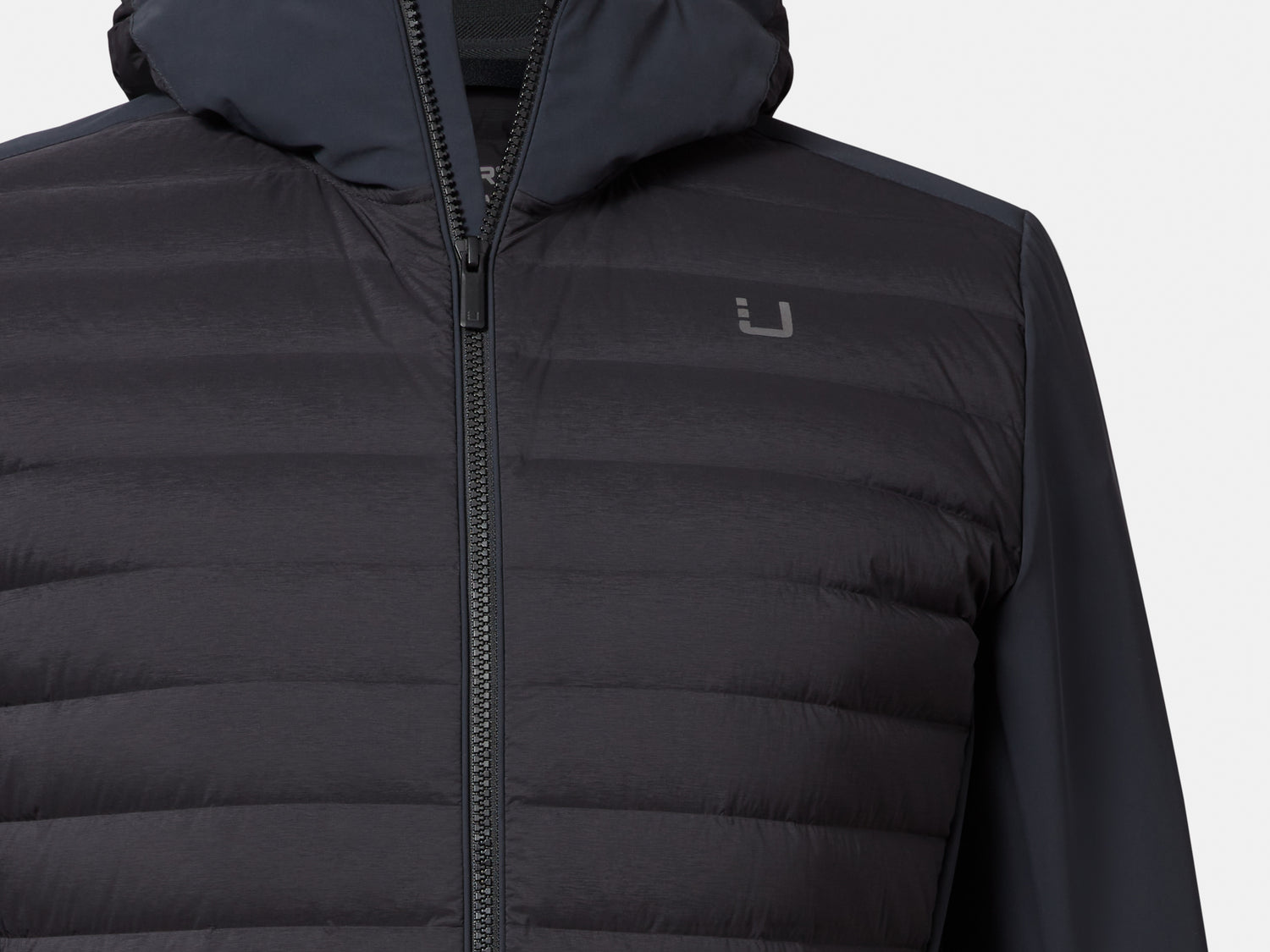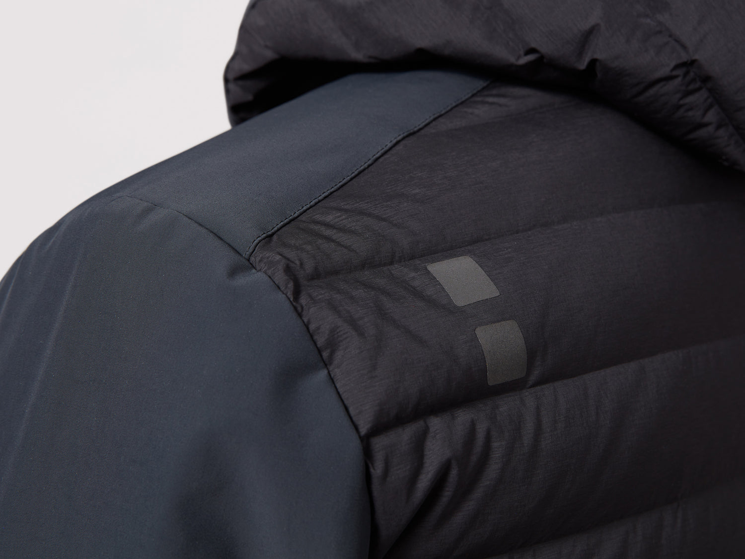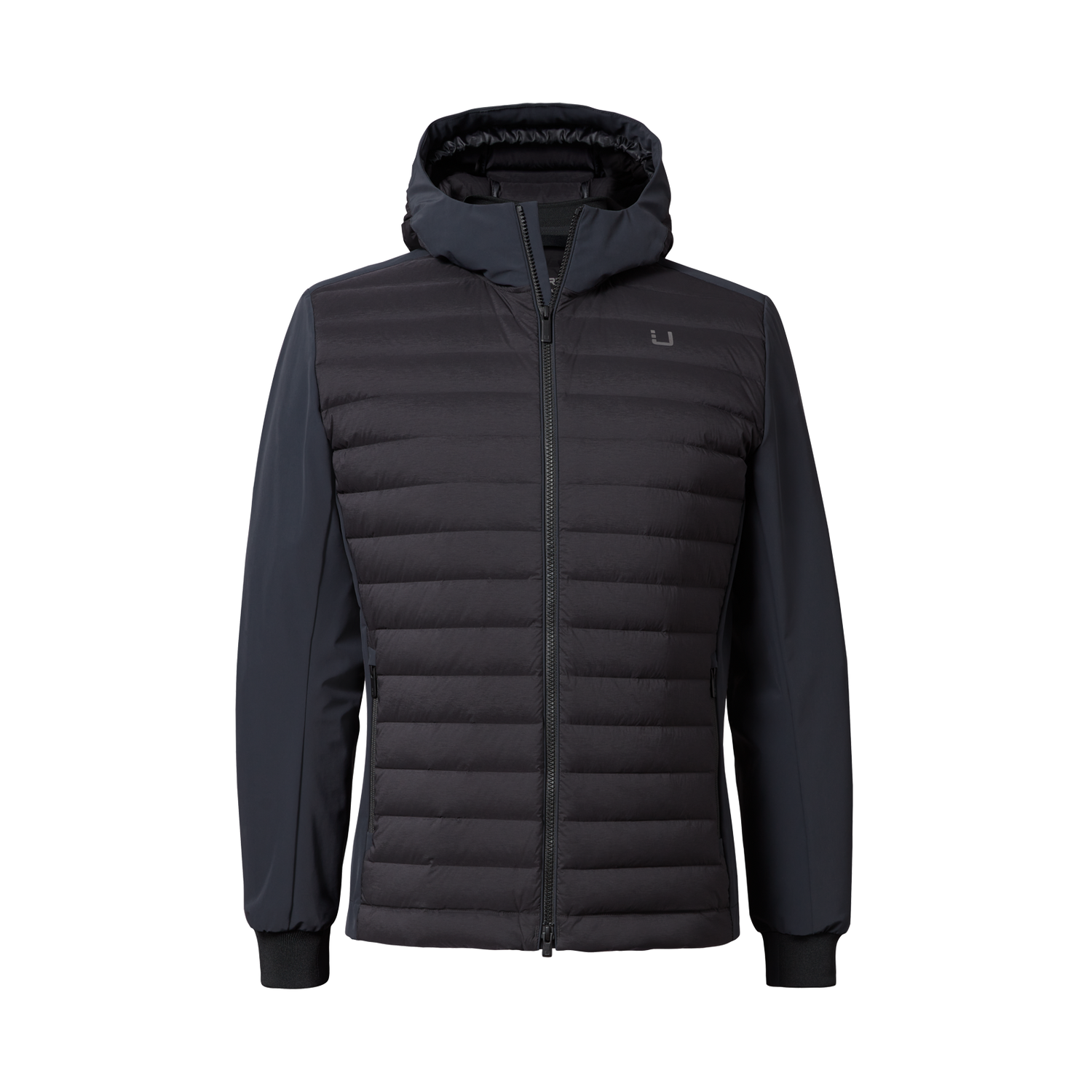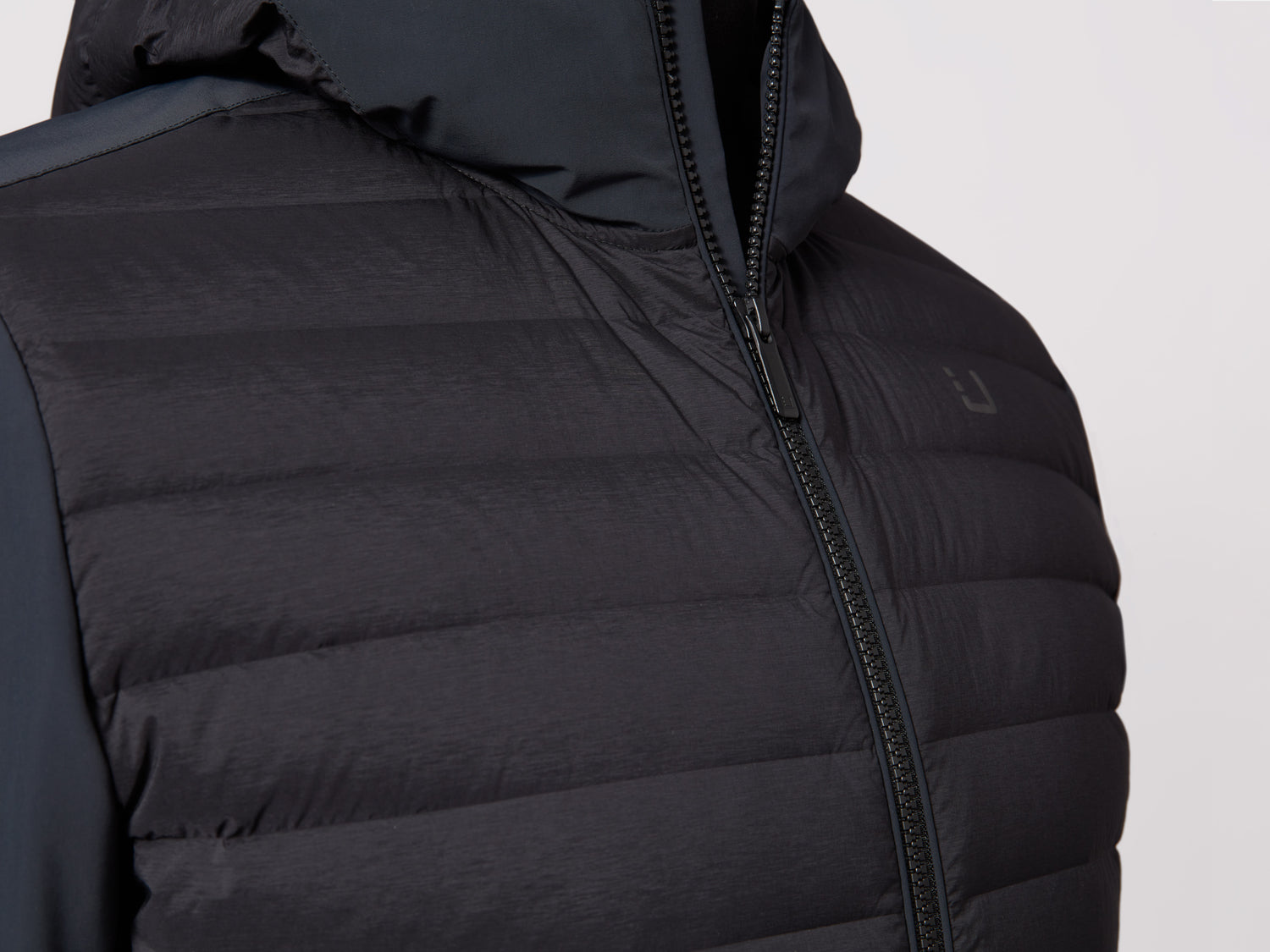 Innovative ultra light down jacket, with our hybrid construction. Sleek, full stretch sleeves and full protection hood.